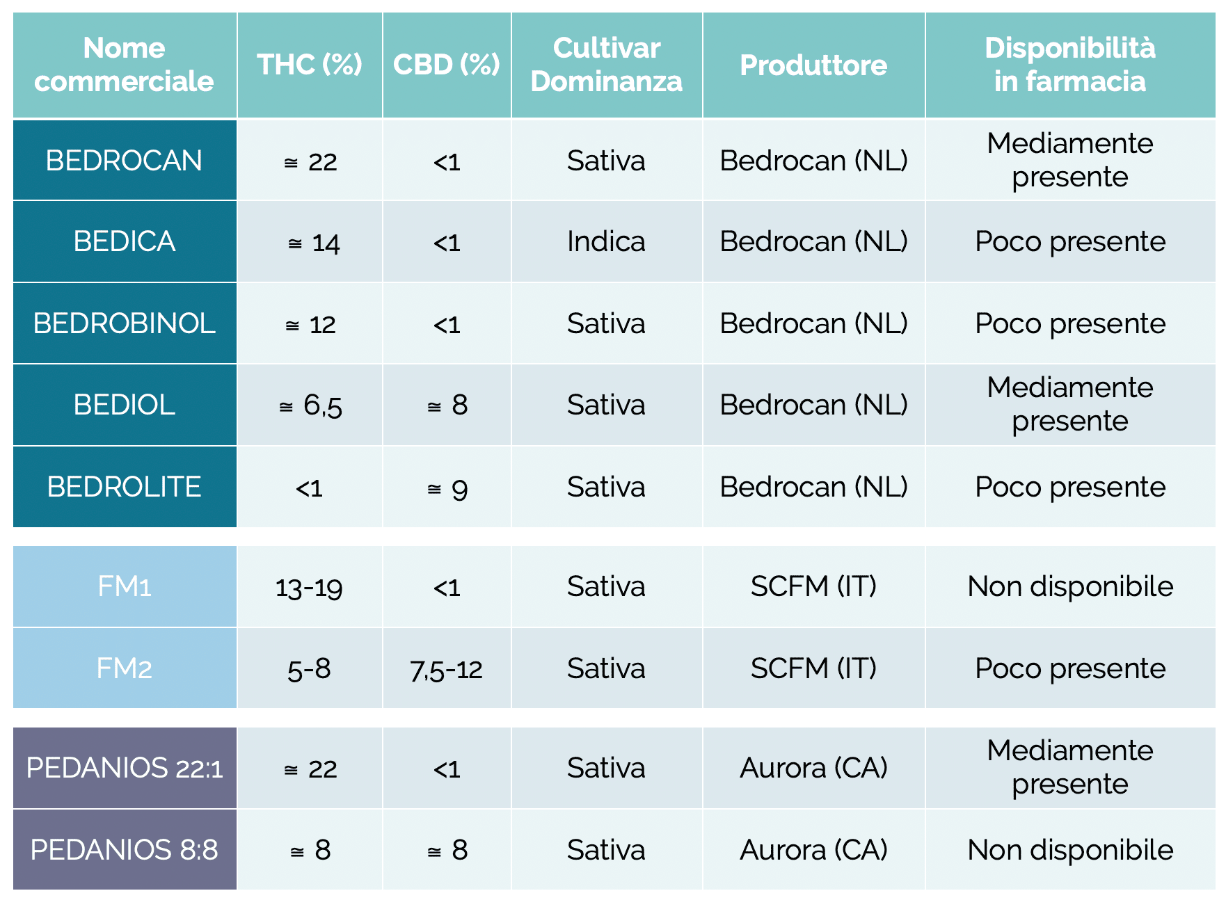Les variétés de cannabis médical actuellement prescriptibles en Italie sont : Bedrocan, Bedrobinol, Bediol, Bedica, Bedrolite, FM1, FM2, Pedanios. Ces variétés sont décrites dans le tableau suivant :